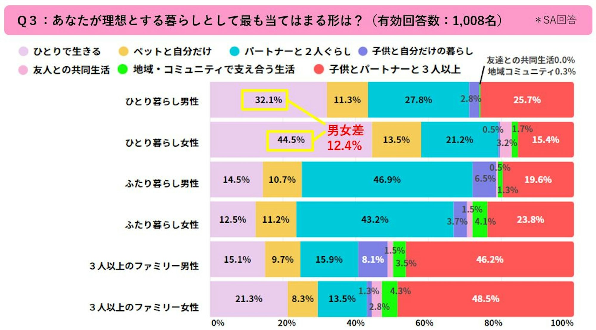 理想の暮らしについては各世帯で大きく異なる結果となりました。すべての世帯において現在の自身の暮らしが理想と回答した人が多数派ではあるものの、5割未満となり、半数の人は現在の暮らしが理想のかたちではないと感じている結果に。特にひとり暮らし世帯では、“ひとりで生きる”が理想と回答した女性が44.5%に対して、男性は32.1%と、男女差12.4%と他の世帯よりも差が大きくなりました。