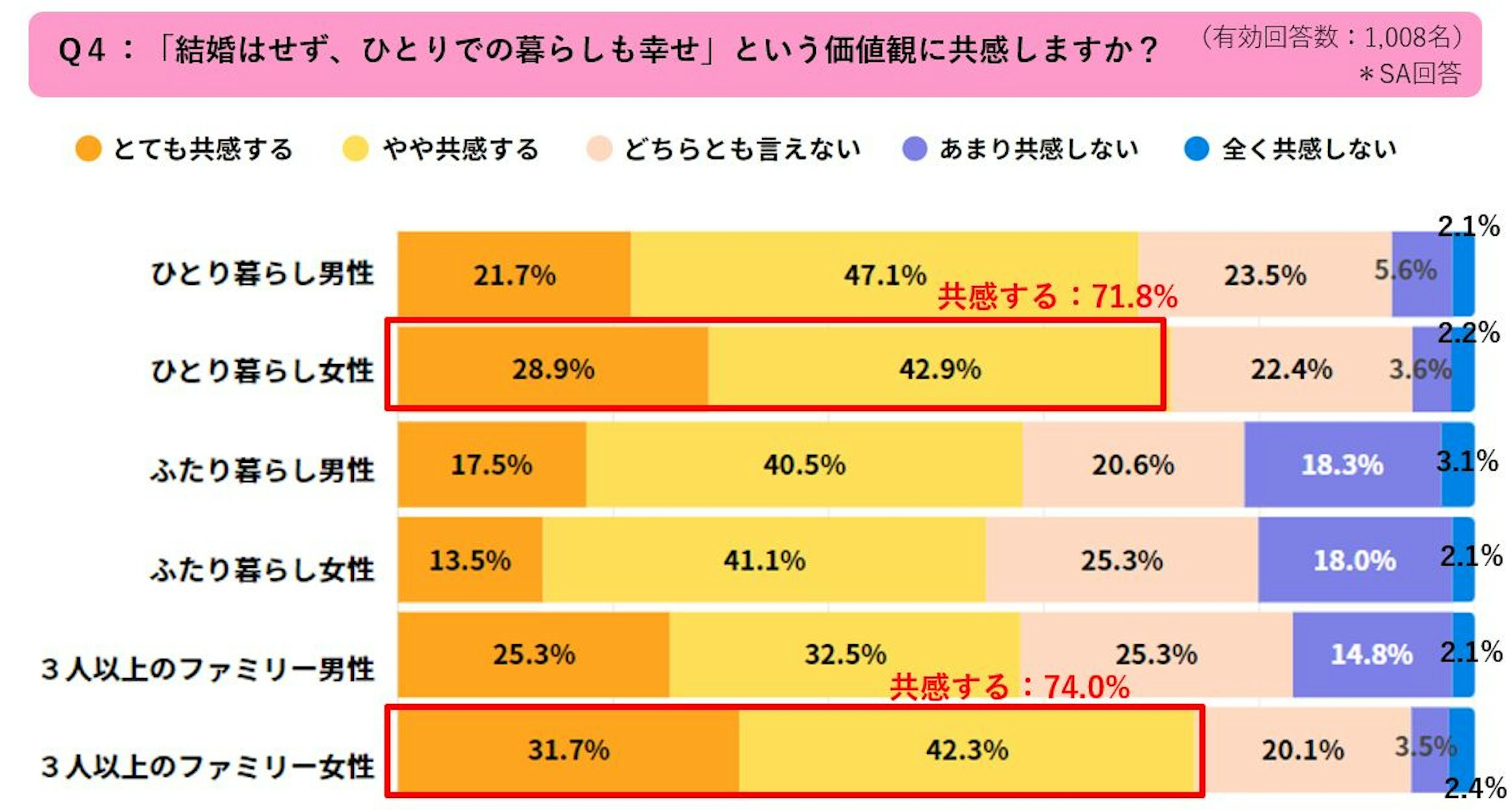ひとりでも幸せという価値観に対して、全体の半数以上が共感すると回答しており、結婚せずひとりで生きるという価値観への理解が浸透していることが分かります。特に、共感すると回答した割合が高い属性では、ひとり暮らし女性の71.8%を上回り、3人以上のファミリー世帯女性が74.0%となりました。ふたり暮らし(同棲・DINKs等)女性を除くと、女性の方が「ひとりでも幸せ」という価値観を支持する割合がやや高い結果となりました。