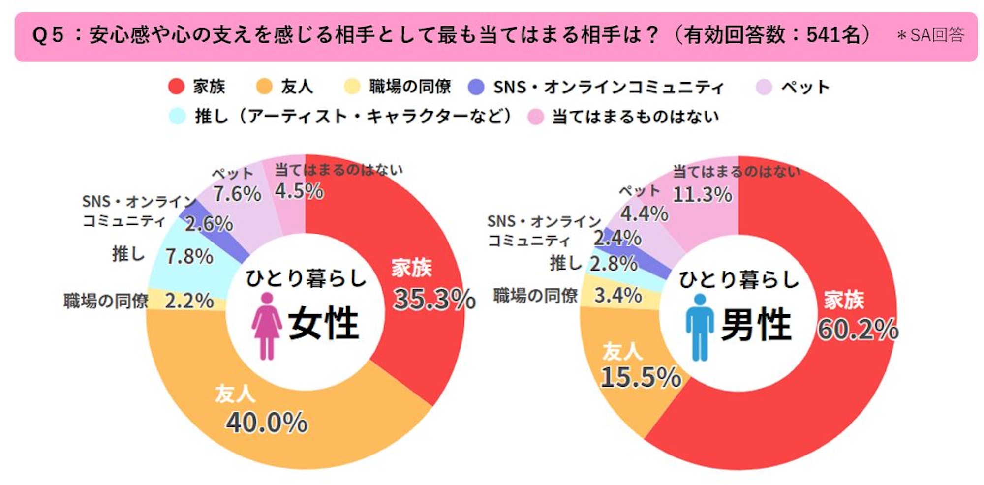 心の支えになっている相手として最も当てはまる相手を1つだけ選択してもらったところ、男性では「家族(60.2%)」が最多となった一方、女性は家族と僅差で「友人(40.0%)」が最多回答となりました。また、男性では「心の支えとして当てはまるものはない」と回答した人が11.3%と、ひとり暮らし男性の10人に1人が心の支えを感じる存在がいないことが分かります。