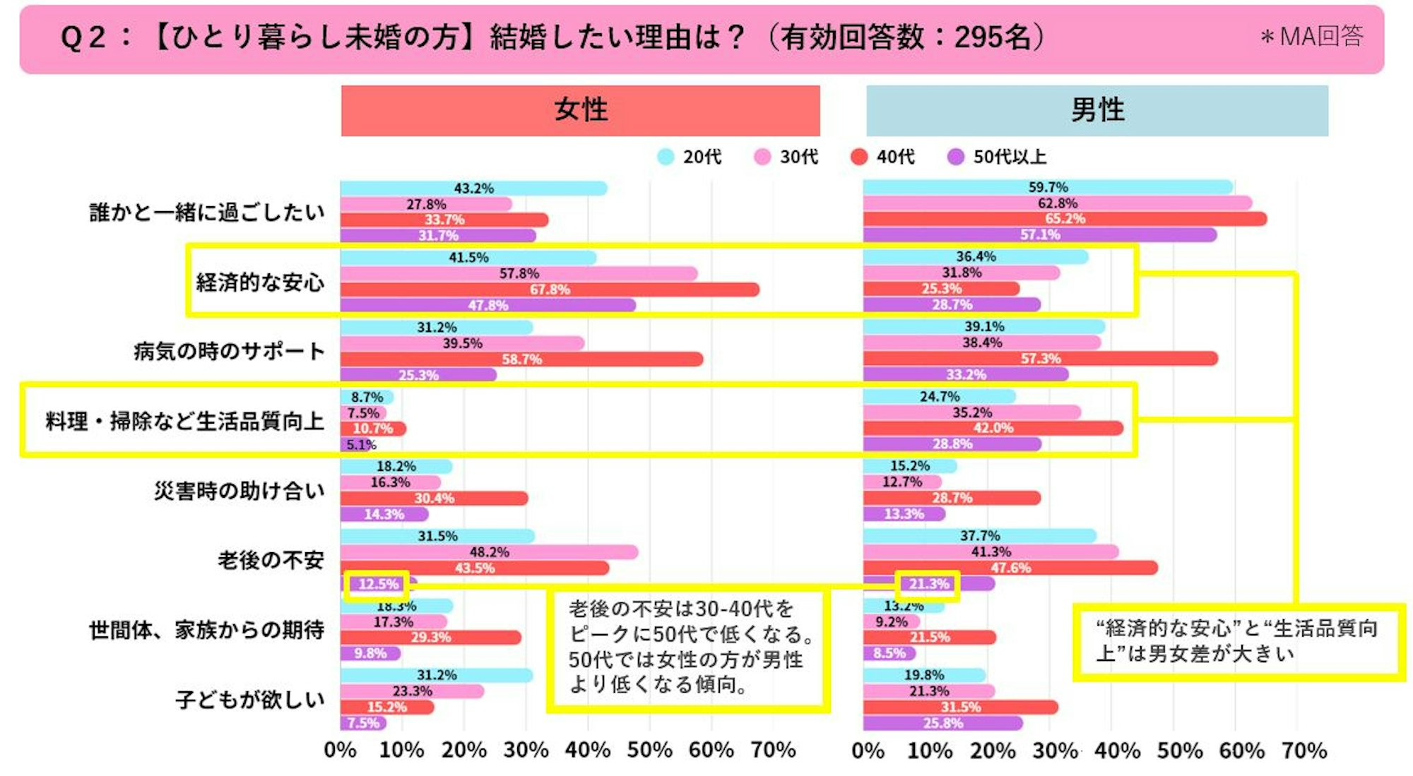 性別・年代別に結婚意欲のほか、なぜ結婚したいと思うのかなど、詳しく調査した結果、男女で結婚に対して期待する内容の違いが見えてきました。