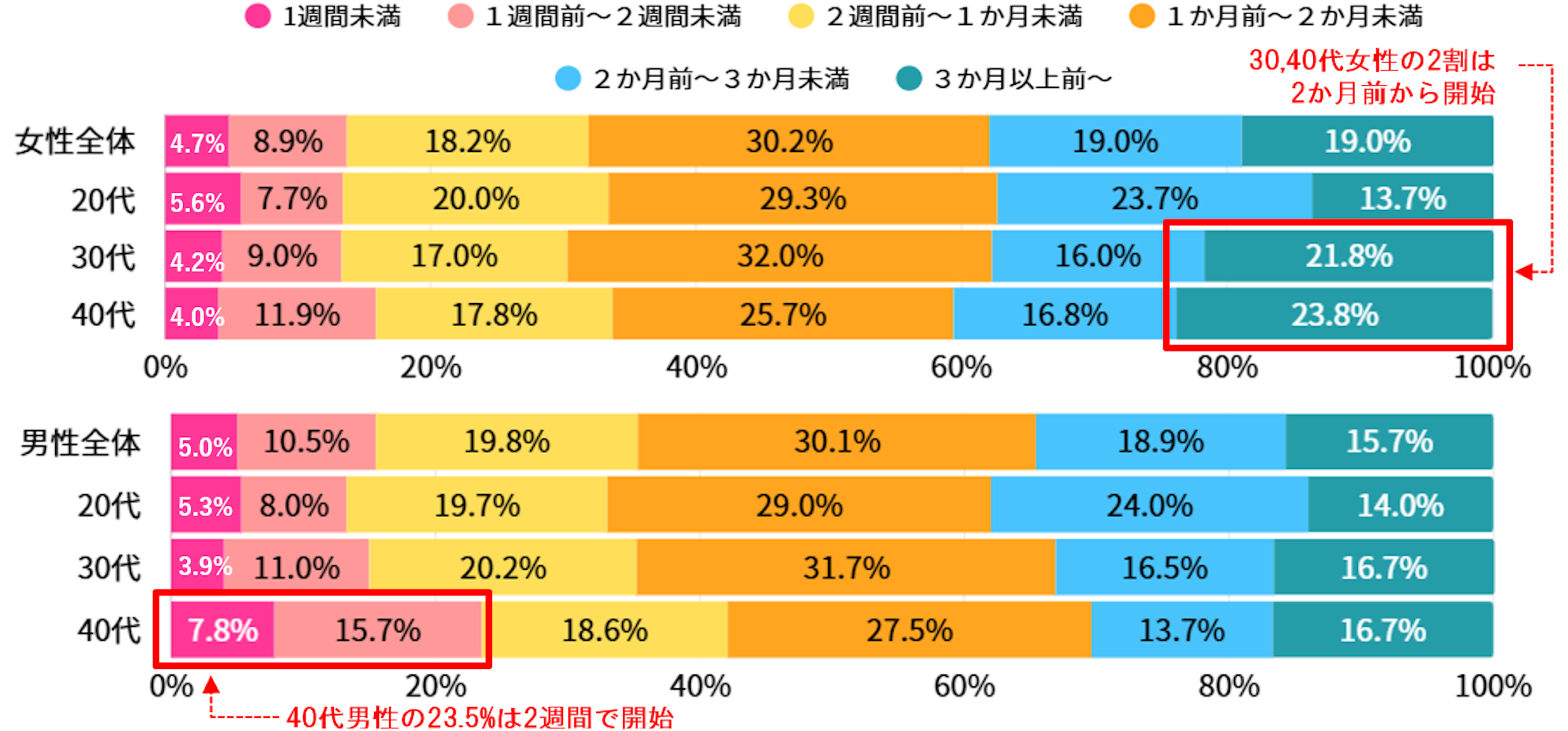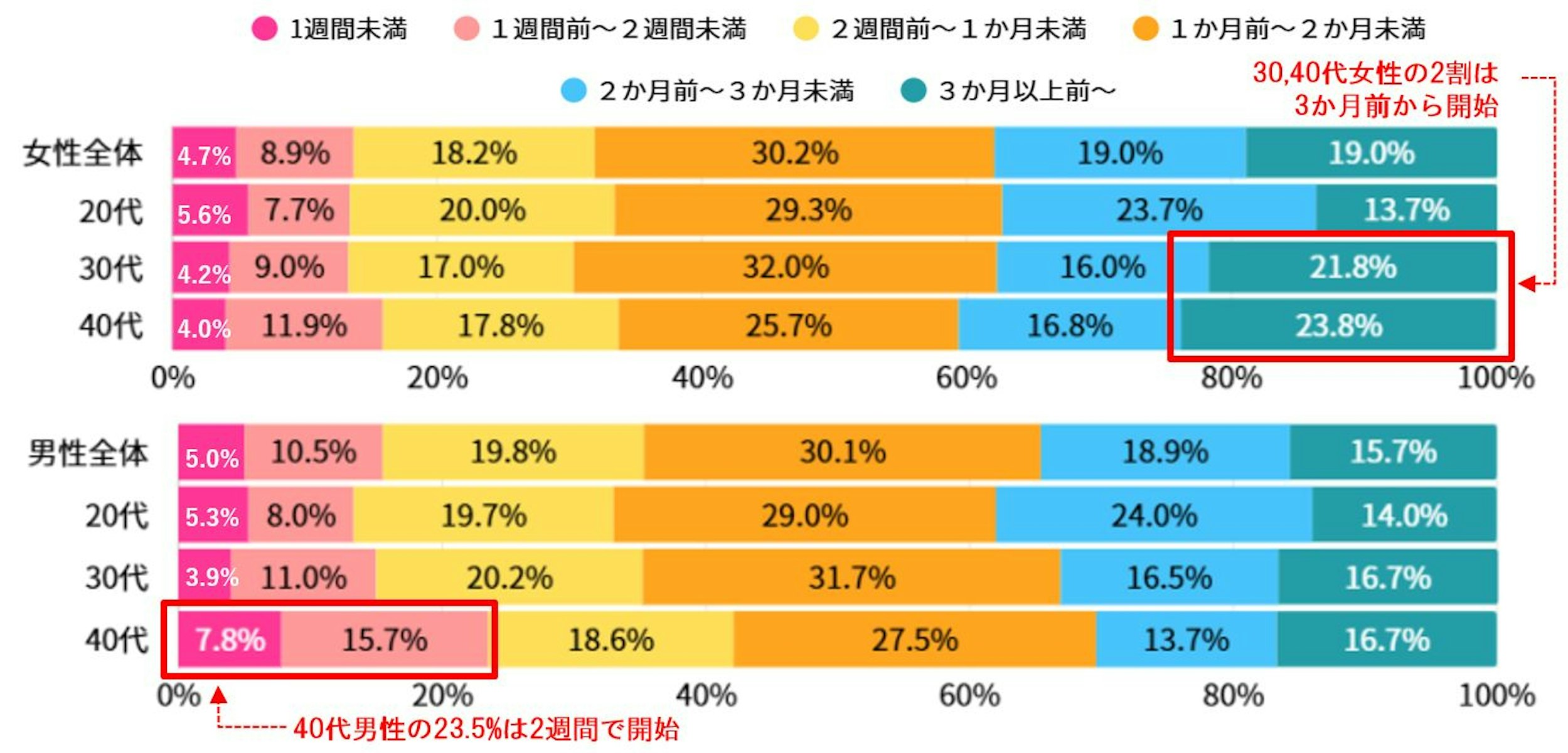 3:引越の荷造り開始は「1か月前~2か月未満」が多数派な一方、40代男性は2週間未満が23.5%と直前派。