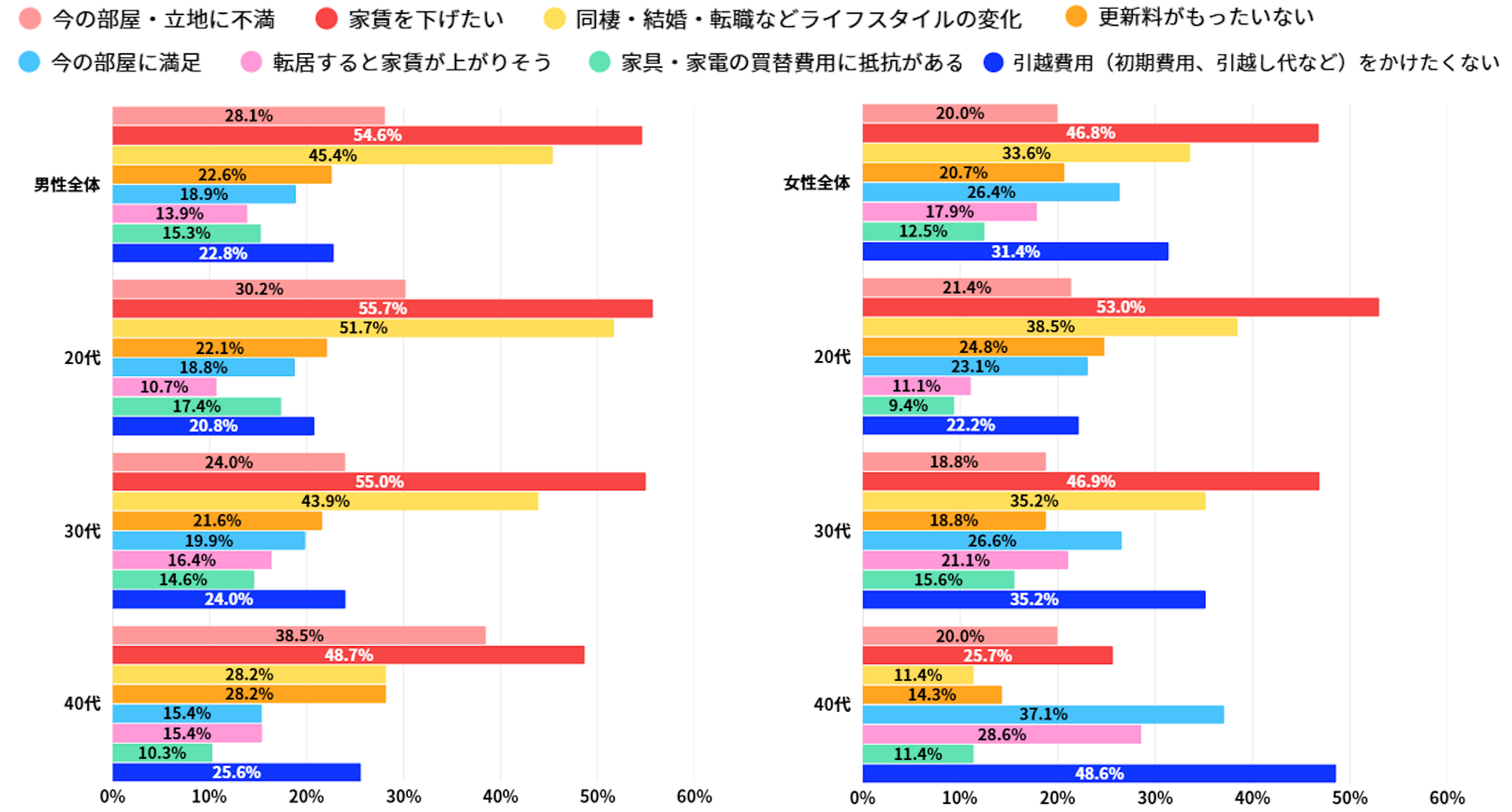 男女ともに更新派が7割以上で、特に40代男性では絶対更新する人が43.6%と、住み慣れた環境での暮らしを継続したいという意向が予想されます。対して転居希望者では20代女性が31.6%とやや高い傾向で、男女ともに20,30代の方がライフスタイルの変化や、現在の住環境をより良いものにしたいというステップアップ思考が感じられます。
