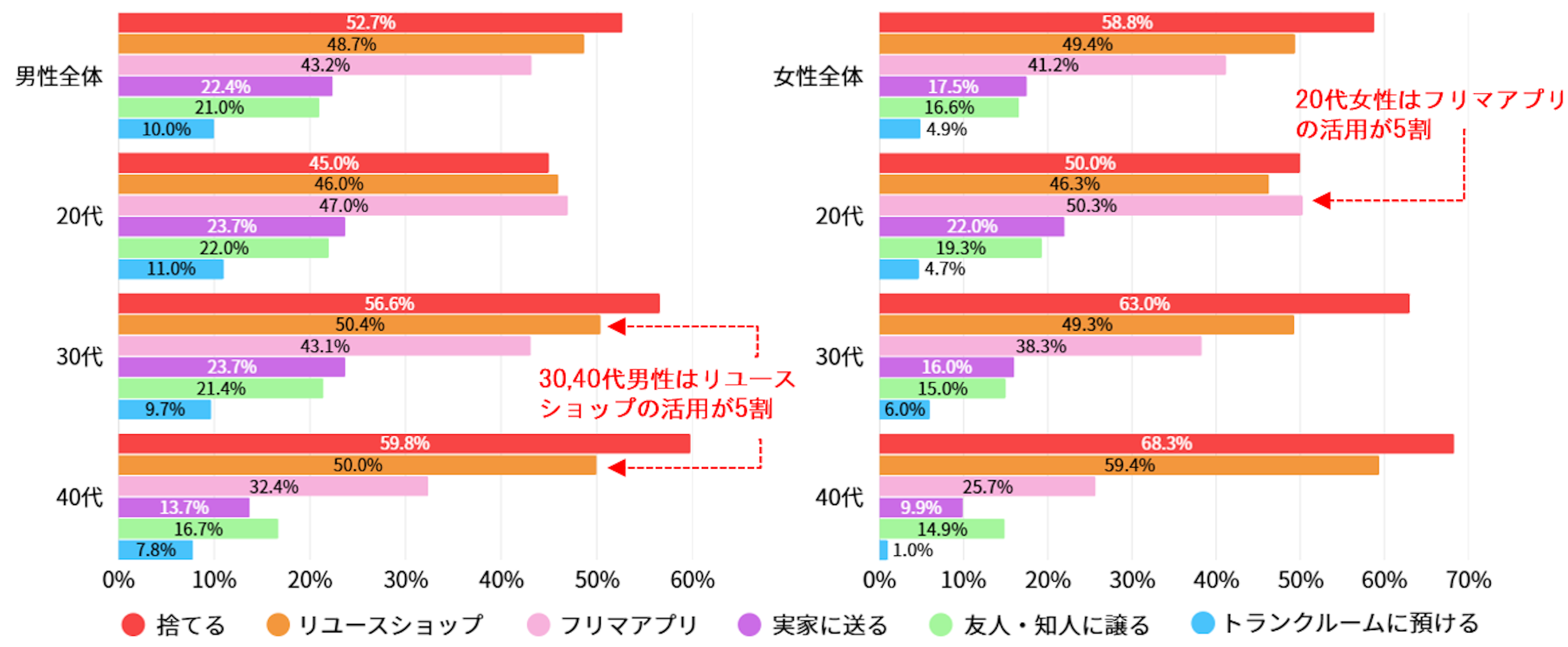 男女各年代で「捨てる」と回答した人が最多で、次いでリユースショップ、フリマアプリの活用となりました。リユースショップの活用では、特に男性30,40代が5割と高く、手間をかけない即時解決を好む傾向に。対して20代女性はフリマアプリの利用が5割と、自分自身でモノの価値を次の人に繋ぐことを重視しているように感じられます。